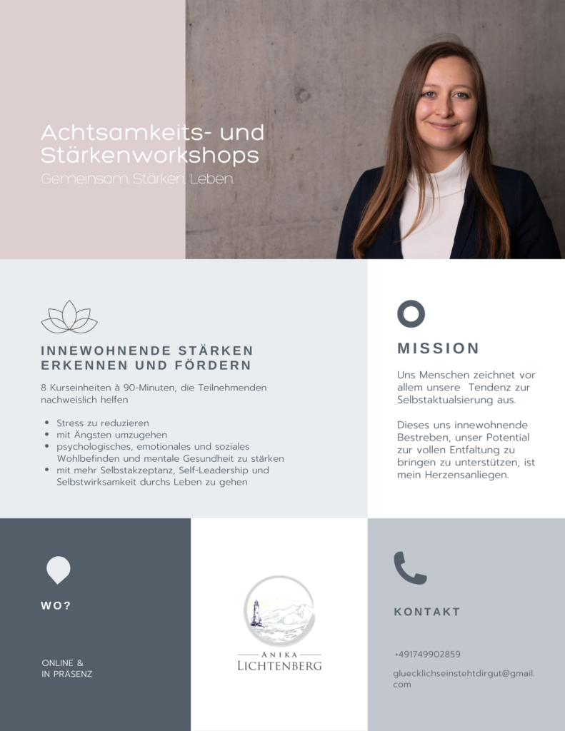 ich möchte euch einladen zu einem Kurs zum Erfahren von mehr Achtsamkeit und eines glücklicheren, erfüllteren Leben. In einem achtwöchigen Gruppenworkshop üben wir wie wir Achtsamkeit und unsere Stärken für ein glücklicheres Leben einsetzen können.
